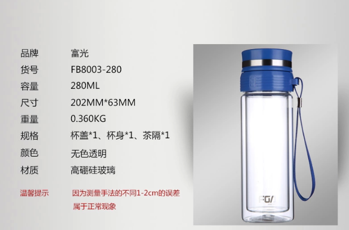 货号:FB8003-280 名称:富光悦品玻璃泡杯280ML 容量:280ML 包装:30个/件,单个彩盒包装 外箱尺寸: |